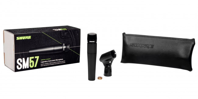 W zestawie znajduje się mikrofon SM57-LCE, uchwyt z adapterem (A25D) oraz pokrowiec transportowy (95A2313).