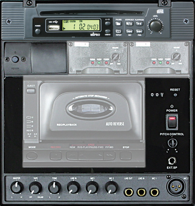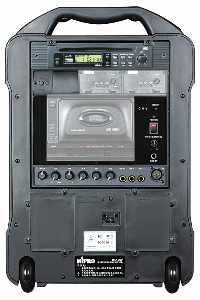 MA 707 PAD to system, który umożliwia montaż do dwóch odbiorników bezprzewodowych oraz dedykowanego magnetofonu kasetowego. Dodatkowo, urządzenie posiada wbudowany odtwarzacz CD/USB Anti Shock z pilotem, co zwiększa jego wszechstronność. Wbudowany mikser oferuje regulację tonów oraz głośności Master, pozwalając na precyzyjne dostrojenie dźwięku.