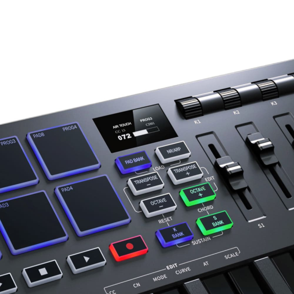 Designed for convenience and versatility, this MIDI keyboard comes equipped with 8 backlit drum pads and 4 assignable knobs, offering extensive customization and creativity options. Its compact size and lightweight design make it ideal for travel and small workspaces.