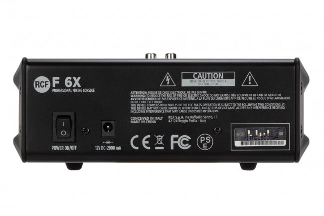 RCF F 6X oferuje 2 wejścia przedwzmacniacza mikrofonowego (XLR), 2 wejścia liniowe mono (TRS) oraz 4 wejścia liniowe stereo (RCA + podwójne TRS).